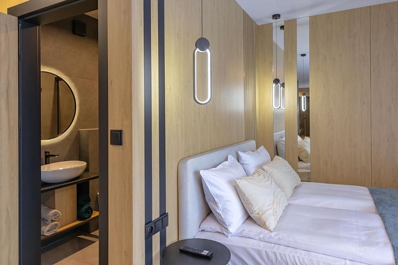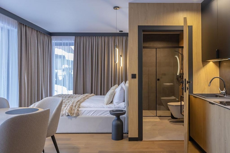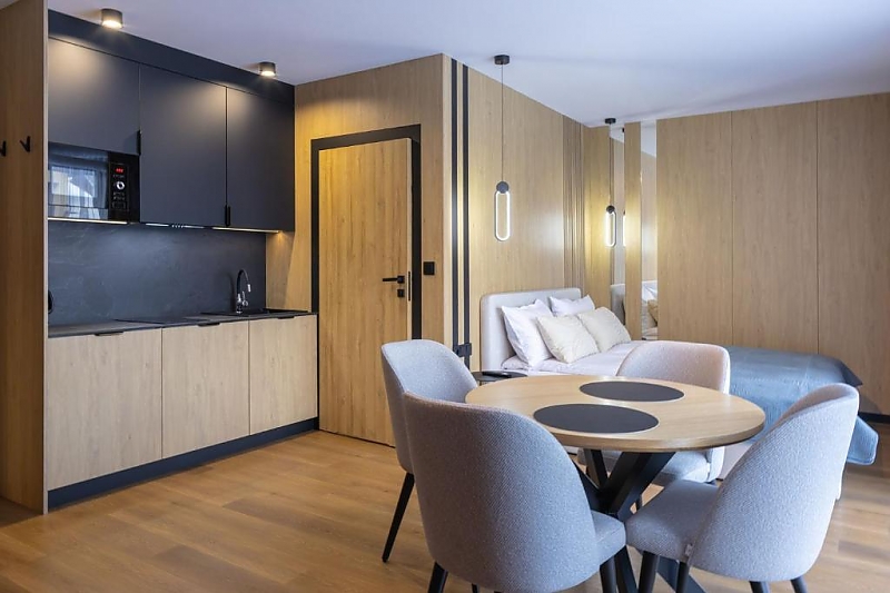 Apartamenty z łazienkami, aneksami kuchennymi i balkonami.