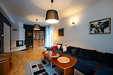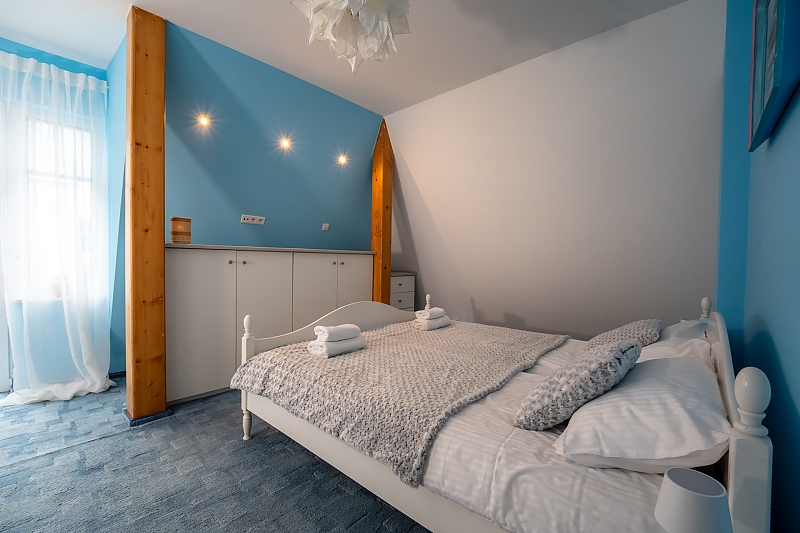 - apartament na 4 osoby - mniejszą część domu przeznaczoną dla czterech osób w której znajdują się dwa pokoje (sypialnia z dużym małżeńskim łóżkiem i pokój dzienny z rozkładanym narożnikiem), wyposażona kuchnia i duża nowoczesna łazienka.