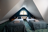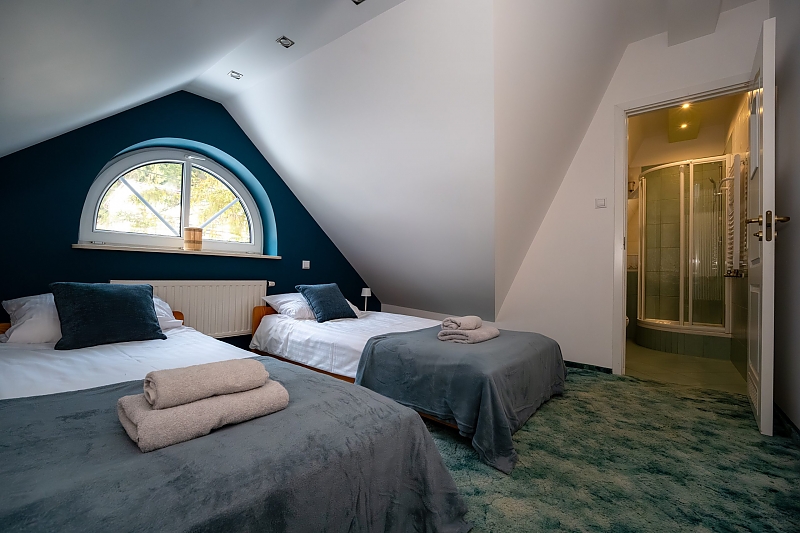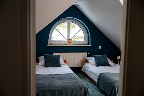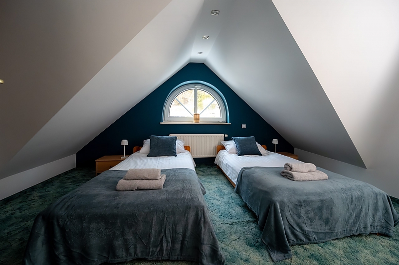 - apartament na 10 osób -  większą część domu,  w której znajdują się cztery przytulne sypialnie (dwie z łóżkami małżeńskimi, jedna z dwoma łóżkami pojedynczymi, jedna czteroosobowa z łóżkiem małżeńskim i piętrowym dla dzieci) każda z komfortowo wyposażoną łazienką. Na dole jest duży salon i kuchnia z pełnym wyposażeniem. W tej części dworku można korzystać z sali gier - do dyspozycji stół pingpongowy, piłkarzyki, lotki.