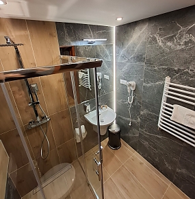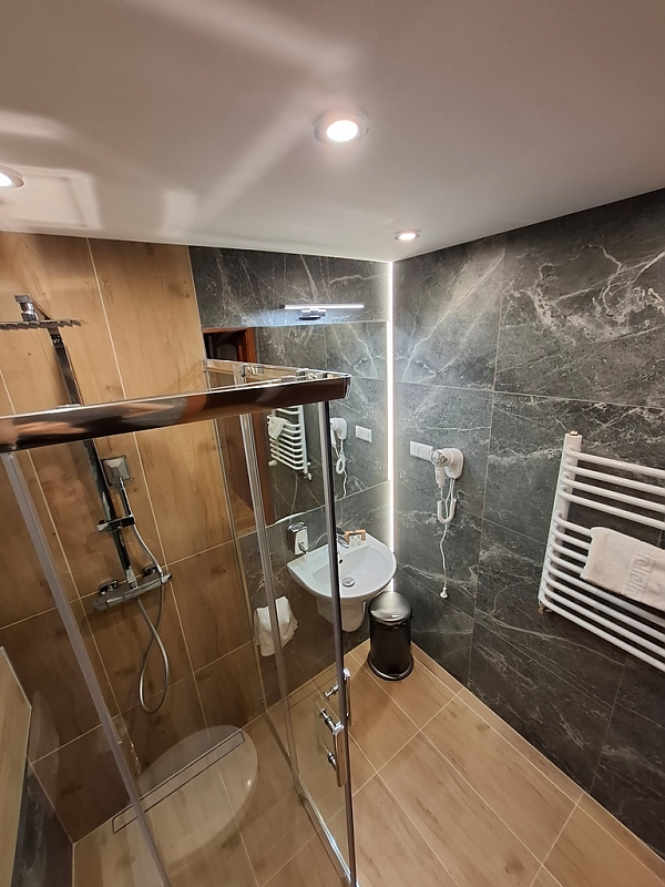 - Nowoczesna łazienka z prysznicem, suszarką do włosów i zestawem kosmetyków hotelowych w każdym pokoju