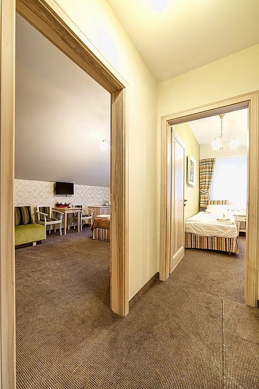 Każdy apartament/studio składa się z 2 niezależnych pokoi, przedpokoju i łazienki. Ma ok. 40 m kwadratowych powierzchni. W mniejszym pokoju są 2 osobne łóżka z możliwością złączenia w jedno duże. W większym pokoju jest duże łoże małżeńskie 2x2m i rozkładana kanapa, na której może spać dwójka dzieci. Dodatkowo są fotele, lodówka, czajnik elektryczny, telewizory.