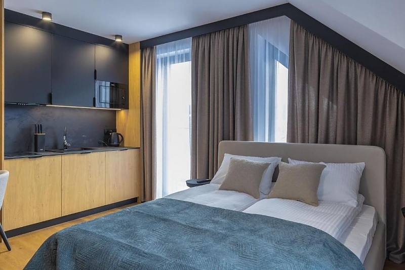 Apartamenty z łazienkami, aneksami kuchennymi i balkonami.